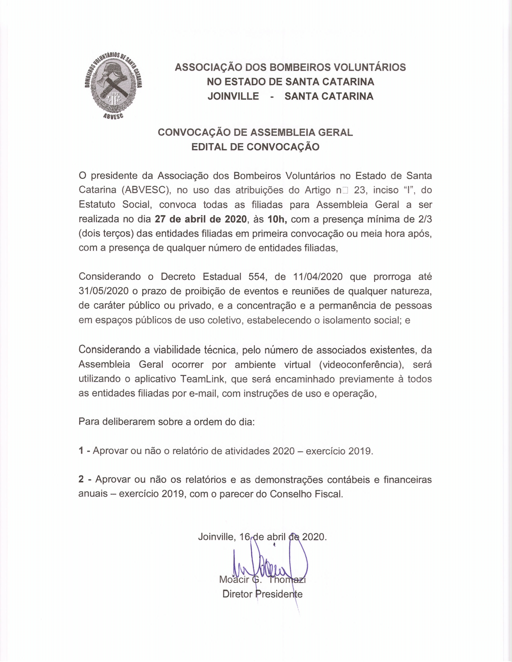 A Diretoria Executiva, Conselho Fiscal e presidentes das associações das unidades filiadas à Associação dos Bombeiros Voluntários no Estado de Santa Catarina (ABVESC) vão se reunir em assembleia geral, no próximo dia 27 de abril, às 10h, por vídeo conferência. Dois temas estão na pauta da assembleia: apreciação do relatório de atividades 2020 – exercício 2019 e demonstrações contábeis do exercício 2019.