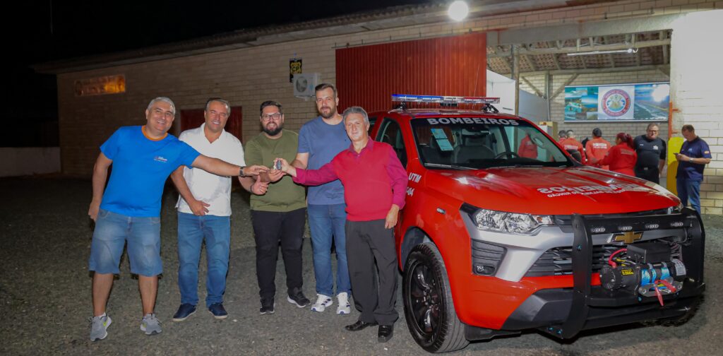 O presidente dos Bombeiros Voluntários de Balneário Rincão, Valter Zanetta (à esq.) e autoridades do município entregam, simbolicamente, a chave da unidade de transporte de materiais