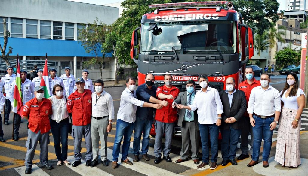 Entrega das chaves do veículo de combate a incêndio e resgate ao presidente da Associação e comando dos Bombeiros Voluntários de Concórdia