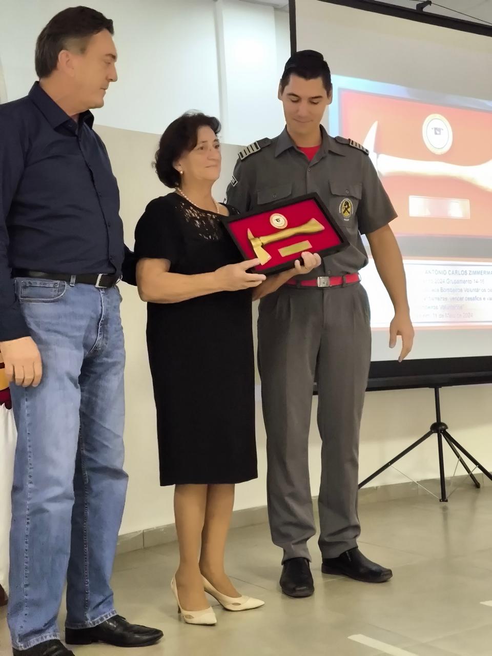O homenageado deste ano com a machadinha simbólica do trabalho bombeiril foi um dos fundadores e ex-prefeito por dois mandatos, Antônio Carlos Zimmermann (in memoriam). A peça, que representa o agradecimento da corporação pelo apoio, foi recebida pela esposa, Maria Teresinha Zimmermann, e o filho, Adriano Marcel Zimmermann.