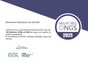 Pelo quinto ano, os Bombeiros Voluntários de Joinville são reconhecidos na maior premiação do terceiro setor brasileiro, o Prêmio Melhores ONGs – edição 2025. O Prêmio reconhece as boas práticas em governança, transparência, comunicação e financiamento. Esta é a nona edição do prêmio – o CBVJ participou em 2020, 2021, 2022 e 2023 – e é realizado pela Certificadora Social e Ambev Voa, com o patrocínio do Mercado Pago, Doare e Prosas. De 2021 a 2023, o CBVJ também foi contemplado com o Prêmio Melhor ONG de Santa Catarina.