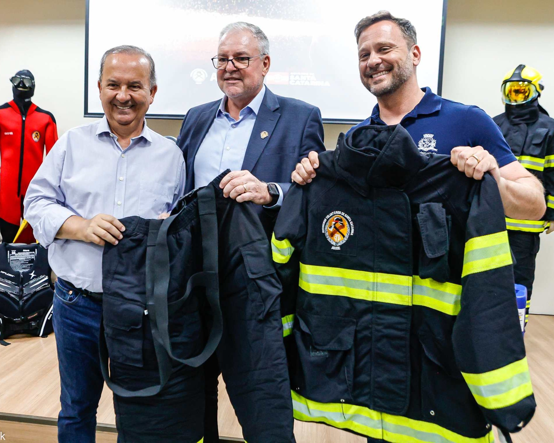 Simbolicamente, o governador Jorginho Mello fez a entrega de um equipamento de proteção utilizado no combate ao fogo para o presidente Ivan Frederico Hudler e ao prefeito Adriano Silva, adquirido com recursos dos termos de fomento vigente no biênio 2023-24. Naqueles períodos, os bombeiros voluntários e a própria Associação receberam R$ 16 milhões do Executivo estadual.