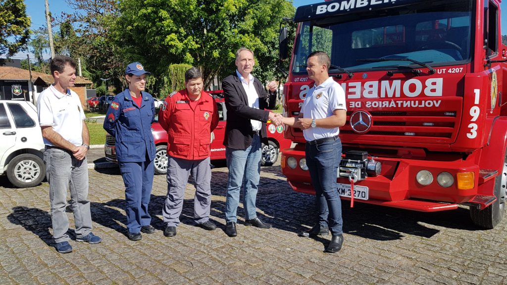 A solenidade de entrega do veículo de combate a incêndio de Schroeder ocorreu dia 14 do mês passado, em frente à Prefeitura, com a presença de bombeiros, autoridades e convidados. Segundo o presidente da Associação, Marcelo Lima, o equipamento foi viabilizado por meio de parcerias empresários, poder Executivo municipal e doações da comunidade.