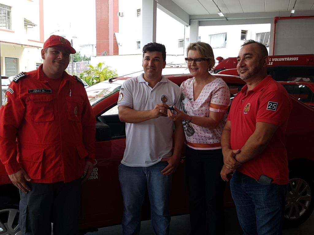 Simone Schramm fez a entrega da carroceira para o subcomandante voluntário do CBVJ, Jackson Seidel