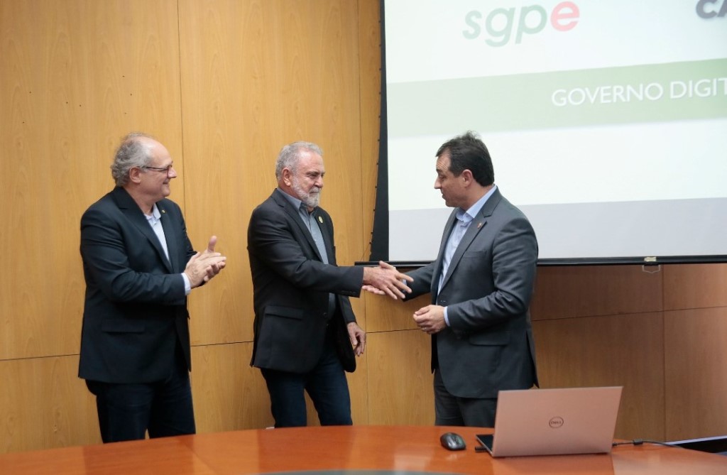 Governador Carlos Moisés cumprimenta o presidente da ABVESC, Moacir Thomazi, após a assinatura do termo de fomento, observados pelo deputado Vicente Caropreso (Foto : Jaksson Zanco/Secom/Dilvulgação)