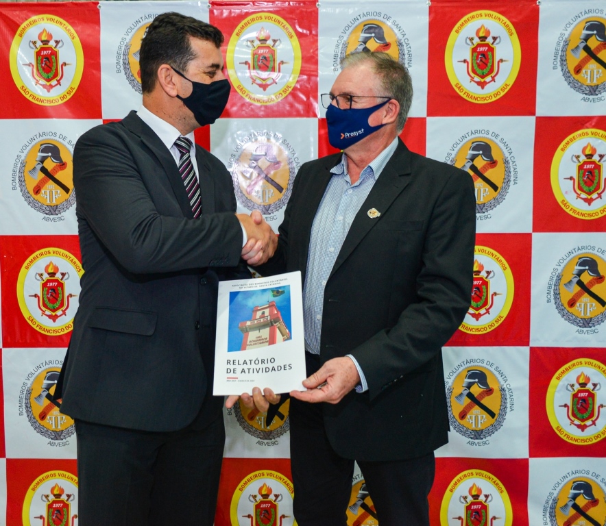 Ivan Frederico Hudler (à dir.) entregou relatório de atividade da entidade para o presidente dos Bombeiros Voluntários de São Francisco do Sul, Celso dos Santos