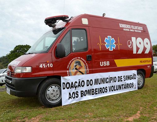 Os Bombeiros Voluntários de Jaguaruna recebeu na manhã de quinta-feira (27/11), a título de doação, uma ambulância para a corporação por parte do município de Sangão. O ato de entrega aconteceu na Prefeitura Municipal e contou com a presença do Prefeito Castilho Silvano Vieira e do Presidente da Associação de Bombeiros Voluntários Evaldo Espíndola.Ao realizar a entrega, o Prefeito Castilho ressaltou que está a disposição dos Bombeiros Voluntários e lembrou do belo trabalho que vem sendo realizado: “Todos os dias eles salvam vidas e atendem a população de Sangão e municípios vizinhos com o máximo de dedicação. Por este belo trabalho, é justo que possamos realizar doações como esta, que irão auxiliar nos trabalhos da corporação”.